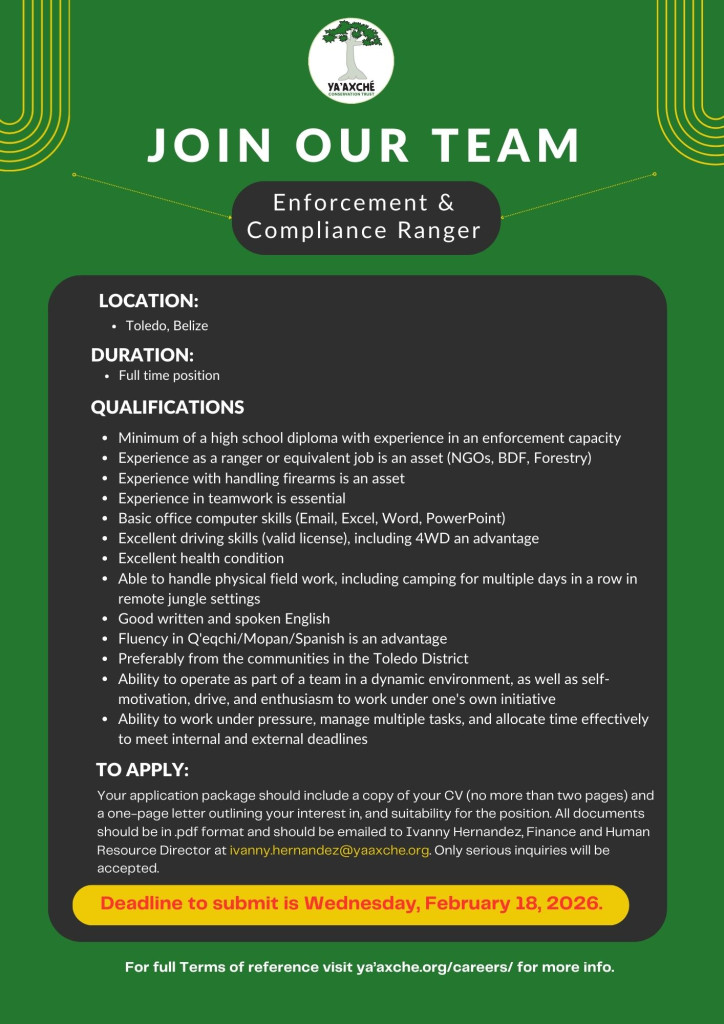 Ya’axché is seeking qualified applicants for the post of Enforcement & Compliance Ranger.